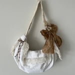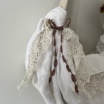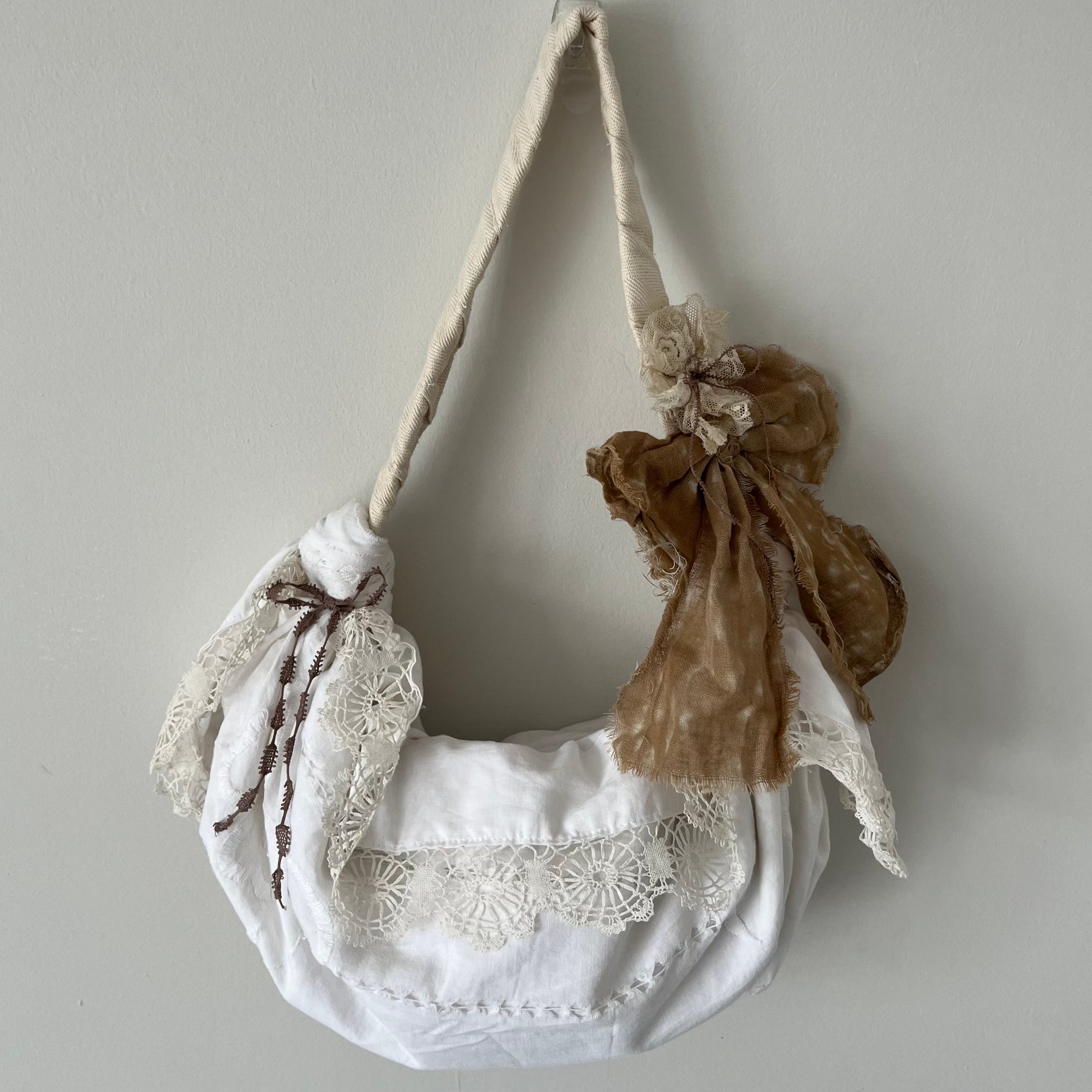 Outer design: Made from vintage white cotton embroidered fabric and antique* cream lace. Includes hand dyed antique lace ribbons and a muslin bow dyed to resemble deer hide.